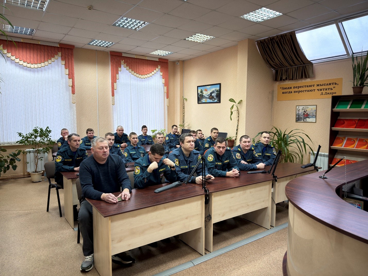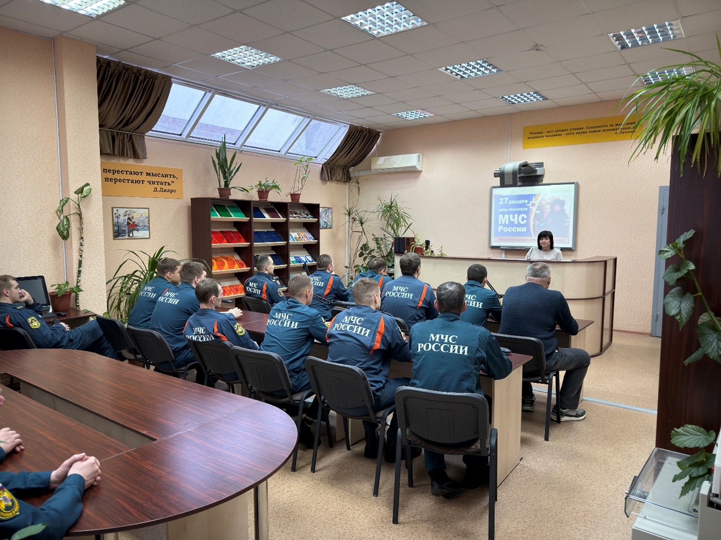 В предверии праздника в читальном зале учебного центра проведена беседа со слушателями учебных групп № 44 и № 45 (Профессиональная подготовка по профессии «Пожарный») на тему: «История создания и развития Министерства Российской Федерации по делам гражданской обороны, чрезвычайным ситуациям и ликвидации последствий стихийных бедствий (МЧС России)».